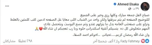 وتابع: “وتم مسح البوست وبتحصل عادى، المهم ما تخلوش كل ده ينسيكم أغنية إسكندرانى حلوة ويا رب تعجبكم إن شاء الله، وإن شاء الله رمضان كريم، تحياتى، أخوكم أحمد السقا”.