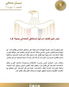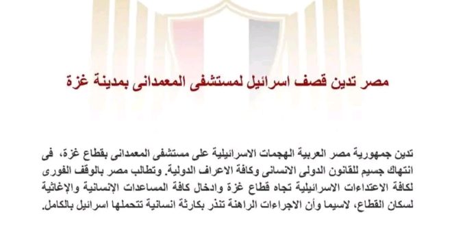 أدانت جمهورية مصر العربية، الهجمات الاسرائيلية على مستشفى المعمداني بقطاع غزة، في انتهاك جسيم للقانون الدولي الإنساني والأعراف الدولية.
