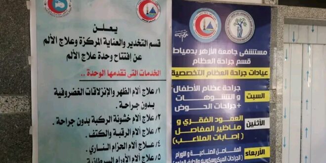 ومن الجدير بالذكر أنه تم افتتاح وحدة علاج الألم التابعة لقسم التخدير والعناية المركزة وعلاج الألم بمستشفيات جامعة الأزهر لتقديم العديد من الخدمات الطبية منها علاج آلام الظهر والانزلاقات الغضروفية بدون جراحة ، وعلاج آلام خشونة الركبة بدون جراحة ، وعلاج آلام الرقبة والكتف ، وعلاج آلام الحزام الناري، وعلاج آلام الأورام السرطانية
