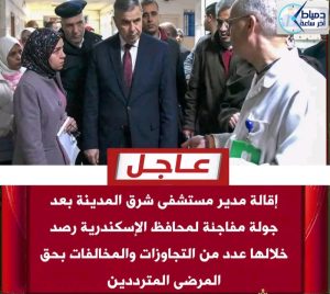 ” إقالة مدير مستشفى شرق المدينة بعد جولة مفاجئة لمحافظ الإسكندرية رصد خلالها عدد من التجاوزات والمخالفات بحق المرضى المترددين “