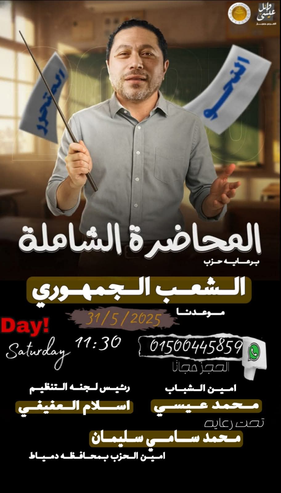 ودعت أمانة الحزب بمركز الزرقا جميع طلاب وطالبات الثانوية العامة إلى الحضور والمشاركة في هذه المراجعة النهائية، التي تأتي ضمن جهود الحزب لدعم الطلاب وتعزيز فرصهم في النجاح والتفوق.