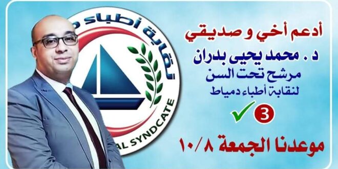 #بكل_الحب_أدعم الدكتور محمد يحي بدران رقم ٣ تحت السن مرشح عضوية نقابة أطباء دمياط و ذلك لرغبته الصادقة في خدمة الأطباء و أمله في دعم أساتذته و زملائه الأفاضل أطباء دمياط
