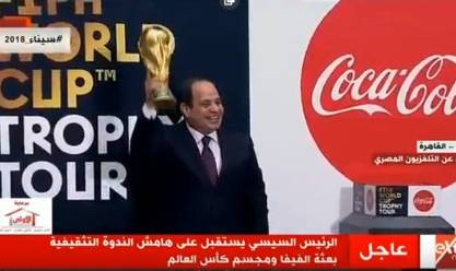 واستقبل السيسي، على هامش الندوة التثقيفية للقوات المسلحة، بعثة الفيفا ومجسم كأس العالم، الذي حمله بيده، في إطار الجولات الترويجية التي يجريها “فيفا” لنهائيات كأس العالم في البلدان المؤهلة للبطولة.