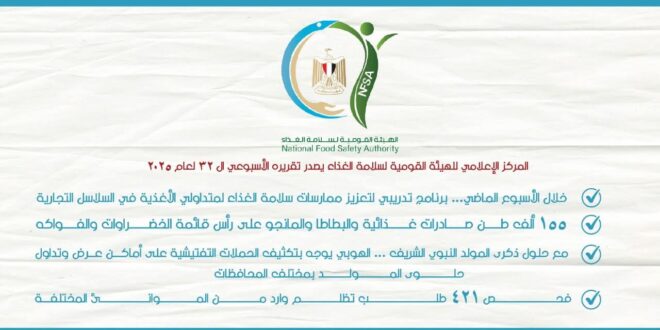أصدر المركز الإعلامي للهيئة القومية لسلامة الغذاء تقريره الأسبوعي الـ 32 لعام 2025، وذلك عن الفترة من 30 أغسطس – 5 سبتمبر، والذي تضمن العديد من الأنشطة المختلفة على النحو التالي: