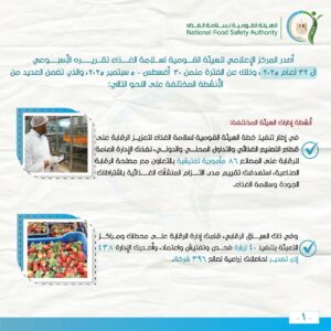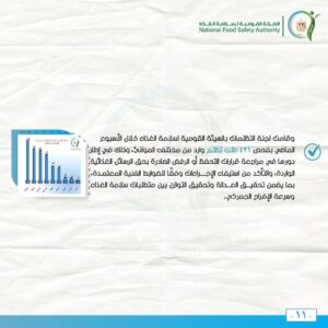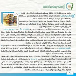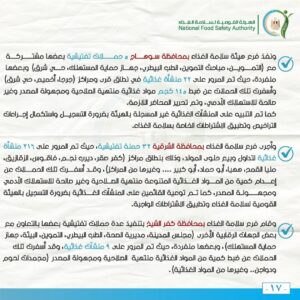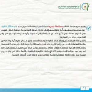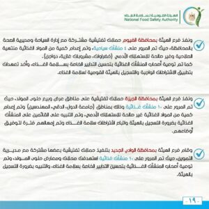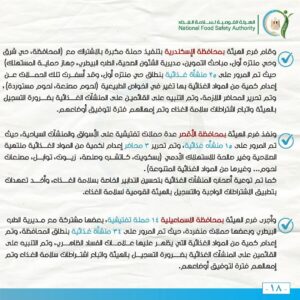 وفي إطار الدور التوعوي والتثقيفي للهيئة القومية لسلامة الغذاء لرفع درجة الوعي العام نحو تحسين التدابير الخاصة بسلامة الغذاء وتعزيز الممارسات الغذائية الصحية السليمة، تم المرور على 25 منشأة غذائية وتم التوجيه نحو ضرورة الالتزام باشتراطات سلامة الغذاء بتلك المنشآت، وتطبيق الإجراءات التصحيحية خلال المرور.