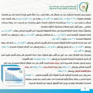 وفيما يخص الصادرات الغذائية، بلغ عدد الرسائل الغذائية المصدرة طبقًا لتقرير الإدارة العامة لكل من الصادرات والواردات بالهيئة 3135 رسالة غذائية بنحو 155 ألف طن، صادرة عن 1150 شركة مصدرة، وقد شملت هذه