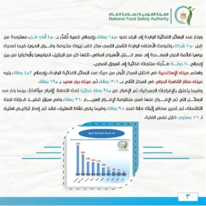 واستمر ميناء الإسكندرية في احتلال المركز الأول من حيث عدد الرسائل الغذائية الواردة، بإجمالي 452 رسالة، يليه ميناء مطار القاهرة الدولي في المركز الثاني بـــ 306 رسالة، ثم ميناء بور سعيد بـ 195 رسالة.