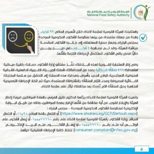 وتهيب الهيئة، برئاسة الدكتور طارق الهوبي، بالسادة المواطنين ضرورة الإبلاغ الفوري عن أية مخالفة قد تمس سلامة الغذاء أو تشكل خطرًا على الصحة العامة، ويمكن تقديم الشكاوى من خلال البوابة الإلكترونية لمنظومة الشكاوى الحكومية الموحدة – مجلس الوزراء عبر الرابط: