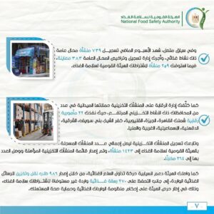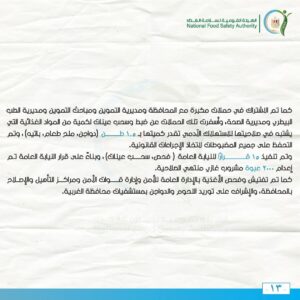 وتم تنفيذ 15 قرارًا للنيابة العامة ( فحص، سحب عينات)، وبناءً على قرار النيابة العامة تم إعدام 2000 عبوة مشروب غازي منتهي الصلاحية.