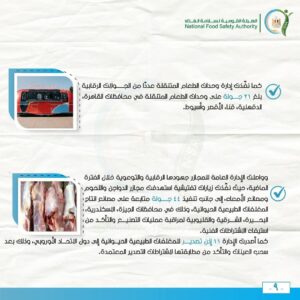 كما تم التحفظ على 23 طن من المواد الغذائية المتنوعة بدون بيانات ومجهولة المصدر (لحوم، دواجن…. وغيرها من المواد الغذائية)، كما تم إعدام مواد غذائية أخرى لظهور علامات الفساد وتغير في الخواص الطبيعية.