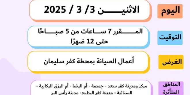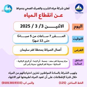 وجاء ذلك نظرًا لوجود أعمال صيانة في محطة كفر سليمان ويبدأ انقطاع المياه من الساعة الخامسة صباحًا وحتى الساعة الثانية عشر ظهرًا.