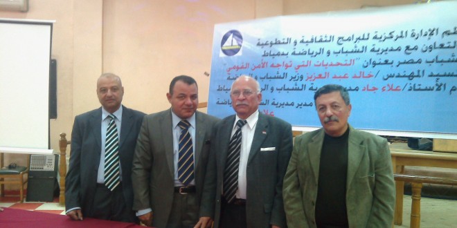 تحت رعاية المهندس / خالد عبد العزيز وزير الشباب والرياضة بدمياط نظمت الادارة المركزية للبرامج التقافية والتطوعية بالتعاون مع مديرية الشباب والرياضة بدمياط وتحت اشراف الاستاذ/ علاء جاد مدير مديرية الشباب والرياضة بدمياط وادارة الشباب برئاسة الاستاذ / وفيق اللبان . الندوة الموسعة تحت عنوان ( التحديات التي تواجه الامن القومي )وذلك بمركز شباب السنانيه وحاضر بها اللواء / طلعت موسي الخبير الاستراتيجي باكاديمية ناصر العسكرية .