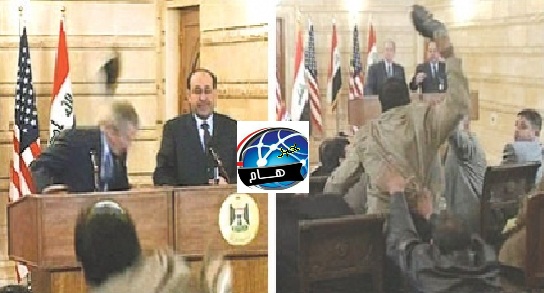 وخلال المؤتمر الصحفي الذي جمعه مساء الأحد ونوري المالكي رئيس الوزراء العراقي بغرض الاحتفال بإقرار الاتفاقية الأمنية ، فوجئ الحضور بالصحفي منتظر الزيدي يقذف زوجي حذاءه على بوش، وبالتزامن مع إلقاء فردة حذاءه الأولى وبعد ذلك تكالب عليه رجال الأمن وطرحوه أرضا، ثم سحبوه إلى خارج القاعة المؤتمر، وسال خيط من الدماء الزيدي على الأرض.
