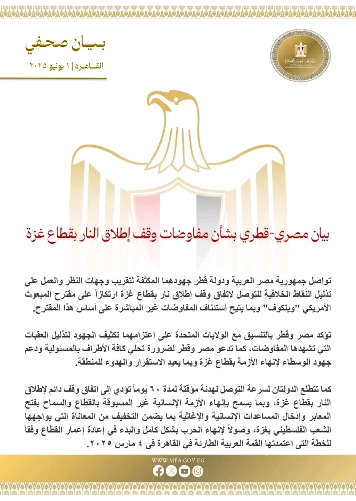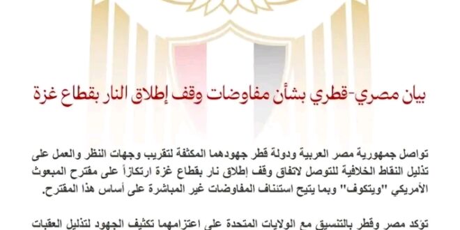 تواصل جمهورية مصر العربية ودولة قطر جهودهما المكثفة لتقريب وجهات النظر والعمل على تذليل النقاط الخلافية للتوصل لاتفاق وقف إطلاق نار بقطاع غزة ارتكازاً على مقترح المبعوث الأمريكي “ويتكوف” وبما يتيح استئناف المفاوضات غير المباشرة على أساس هذا المقترح.