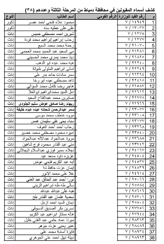 أعلنت مديرية التربية والتعليم بدمياط عن أسماء 38 معلمًا مقبولًا في المرحلة الثالثة من مسابقة 30 ألف معلم.