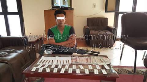 ضبط (شخصين ) لقيامهما بالإتجار فى المواد المخدرة.. وبحوزتهما ( بندقية خرطوش، فرد خرطوش، 62 لفافة من مخدر الحشيش،100 قرص مخدر) .