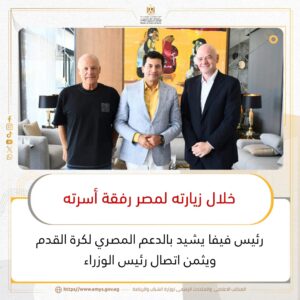 وثمن رئيس “فيفا” ما يقدمه دولة رئيس مجلس الوزراء من دعم كبير لتطوير البنية التحتية الرياضية والسياحية، وحرصه على توفير بيئة احترافية تعكس رؤية واضحة، مؤكدًا أن مصر نموذجًا ملهمًا في الاستثمار الرياضي والسياحي.