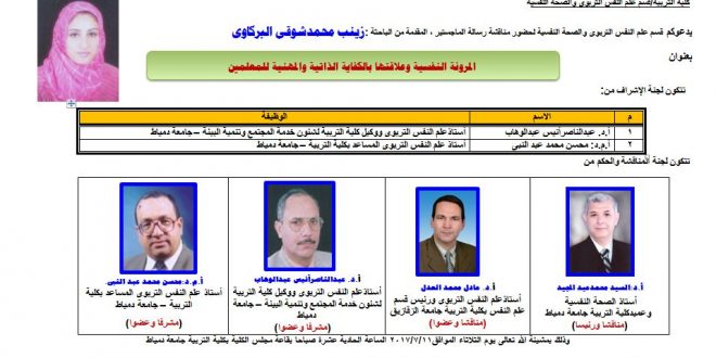 كما عودتنا محافظة دمياط على أنها ولادة دائما للعلماء و للكوادر واليوم تنجب لنا جامعة دمياط قيمة كبيرة فى عالم علم النفس التربوى وهى الدكتورة زينب البركاوي التى تاقشت صباح اليوم رسالة الماجستير تحت عنوان (المرونة النفسية وعلاقتها بالكافية الذاتية والمهنية للمعلمين وذلك فى كلية التربية جامعة دمياط فى قاعة مجلس الكلية و الجدير بالذكر أن المناقشة استمرت لمدة ثلاث ساعات وتتكون لجنة المناقشة والحكم أ.د _ السيد عبد المجيد عميد كلية التربية جامعة دمياط (مناقشا رئسيا) وأ.د عادل محمد العدل أستاذ علم النفس بكلية التربية جامعة الزقازيق (مناقشة عضوا) و أ.د عبد الناصر أنيس أستاذ علم النفس التربوى ووكيل الكليةالتربية جامعة دمياط لخدمة شئون المجتمع و البيئة (مشرفا عضوا ) و أيضا أم.د محسن عبد النبى أستاذ علم النفس التربوى المساعد بكلية التربية جامعة دمياط و كما حضر المناقشة عدد كبير من الشخصيات العامة التى لها ثقلها أمثال العميد على العساس مأمور قسم أول و دكتور سيد دعدور نائب رئيس الجامعة لقطاع خدمة المجتمع و تنمية البيئة و دكتور صلاح المتبولى دكتور علم النفس بكلية التربية النوعية و بحضور رئيس قسم علم النفس التربوي و الصحة النفسيه ا.م.د جمال الدين الشامي و بعد عرض أراء اللجنة والمناقشة تم منح الدكتورة زينب درجة الإمتياز .