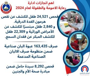 أعلنت مديرية الصحة بدمياط نتائج إدارة رعاية الأمومة والطفولة، خلال العام الماضي، والتي تضمنت فحص 24521 طفل ضمن برنامج الكشف عن نقص هرمون الغدة الدرقية للأطفال حديثي الولادة، فضلا عن تحويل 424 حالة إيجابية لقصور الغدة الدرقية للتأمين الصحي، إضافة الي تحويل 63 حالة اشتباه تمثيل غذائي لسحب عينة وريدية