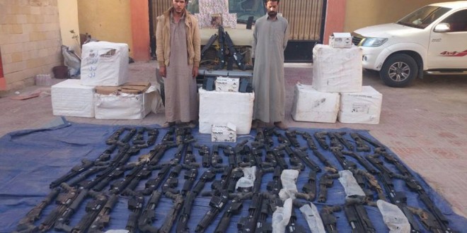 إستمراراً لجهود قوات حرس الحدود فى توجيه ضرباتها القاصمة للعناصر الإجرامية والمهربين وتجار المواد المخدرة التى تستهدف الإضرار بالأمن القومى المصرى على كافة الإتجاهات الإستراتيجية .. فقد تمكنت قوات حرس الحدود فى نطاق الجيش الثانى الميدانى من ضبط مسدس 9مم و(2) خزنة مسدس وعدد (15) طلقة عيار 9مم بالإضافة إلى ضبط (2) عربة محملين بعدد (27) لفافة لنبات البانجو المخدر بإجمالى وزن (9) كجم وعدد (494) قاروصة سجائر مسرطنة وفى إطار الحد من قيام العناصر الإجرامية بتخريب الإقتصاد القومى تم ضبط مبلغ مالى مزيف قدره (10350) جنيه مصرى .