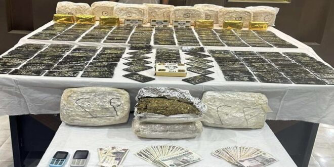 وضبط وبحوزتهما كمية من مخدر الحشيش وزنت 20 كيلو جرام – كمية من مخدر الهيدرو وزنت 40 كيلو جرام وبمواجهتهما إعترفا بحيازتهما للمواد المخدرة بقصد الإتجار وتقدر القيمة المالية للمواد المخدرة المضبوطة بـ حوالى (1,140,000) جنيه وتم إتخاذ الإجراءات القانونية.