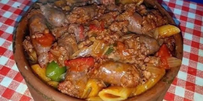 والسجق بيتحمر في زيت وتنزيل عليه ببصل مكعبات وفلفل و طماطم وملح وفلفل وكمون