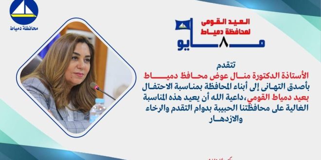 فى الثامن من مايو من كل عام تحتفل محافظة دمياط بعيدها القومى وذلك تخليدًا لبطولات الأجداد فى التصدى لجيوش الغزاة والدفاع عن الوطن عام ١٢٥٠ ميلادية ،، وبهذه المناسبة،، هنأت الأستاذة الدكتورة منال عوض محافظ دمياط، أبناء المحافظة، كما أكدت أن هذه الذكرى جسدت روح الوطنية و الوحدة التى كانت ولازالت اهم السمات الشخصية لأبناء مصر على مر العصور ويتوارثها الأبناء جيل بعد جيل ..