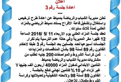 قاعة افراح ستاد دمياط بالمزاد العلنى