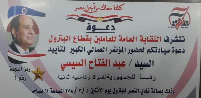تنظم النقابة العامة للبترول، مؤتمر لعمال السويس، غداً الاثنين بالصالة المغطاة لشركة النصر للبترول، لتأييد الرئيس عبد الفتاح السيسي لفترة رئاسية ثانية خلال الانتخابات الرئاسية المقرر إجراءها نهاية الشهر الجاري، ويقام المؤتمر تحت رعاية “حملة كلنا معاك من أجل مصر”.