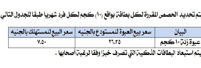 هذا .. ويشير الدكتور المحافظ إلى أن المحافظة تلتزم بتطبيق المنظومة وفقاً للتوجية الوزاري الصادر من وزارة التموين بالضوابط والقواعد الواردة إعتباراً من 1/12/2015 على أن يتم تحديد الحصص المقررة لكل بطاقة بواقع 10 كيلو جرام شهرياً لكل فرد طبقاً للجدول الإسترشادي الوارد .