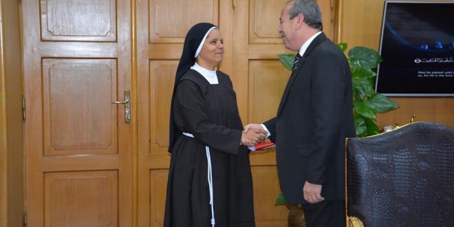 استقبل الدكتور إسماعيل عبد الحميد طه محافظ دمياط اليوم الاخت كريستين مهنا مدير إدارة مدرسة الراهبات الفرنسيسكان وعدد من مدرسى وطلاب المدرسة