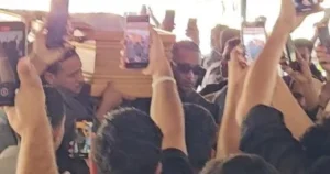 محمد رمضان يرافق جثمان والده إلى مسجد مصطفى محمود لأداء الصلاة عليه