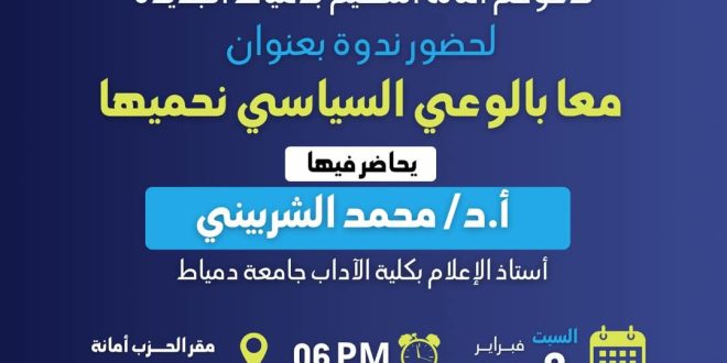 في السادسة من مساء السبت 8 فبراير، يلتقي الحاضرون مع الأستاذ الدكتور محمد الشربيني، أستاذ الإعلام ، بجامعة دمياط في مقر الحزب بأمانة دمياط الجديدة،