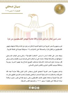 تعرب جمهورية مصر العربية عن إدانتها الشديدة لإعلان إسرائيل عن إنشاء وكالة تستهدف تهجير الفلسطينيين من قطاع غزة، والمصادقة على الاعتراف بـ١٣ مستوطنة جديدة في الضفة الغربية.