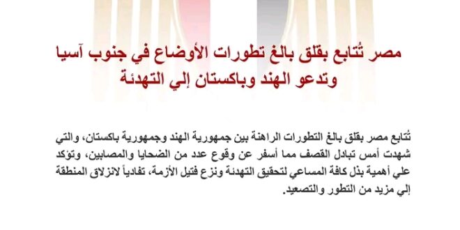 تُتابع مصر بقلق بالغ التطورات الراهنة بين جمهورية الهند وجمهورية باكستان، والتي شهدت أمس تبادل القصف مما أسفر عن وقوع عدد من الضحايا والمصابين، وتؤكد علي أهمية بذل كافة المساعي لتحقيق التهدئة ونزع فتيل الأزمة، تفادياً لانزلاق المنطقة إلي مزيد من التطور والتصعيد.