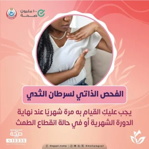 كشفت وزارة الصحة والسكان عن آليات الفحص الذاتي لسرطان الثدي وقال : يجب القيام بالفحص الذاتى مرة واحدة شهريًا عند نهاية الدورة الشهرية أو في حالة انقطاع الطمث.