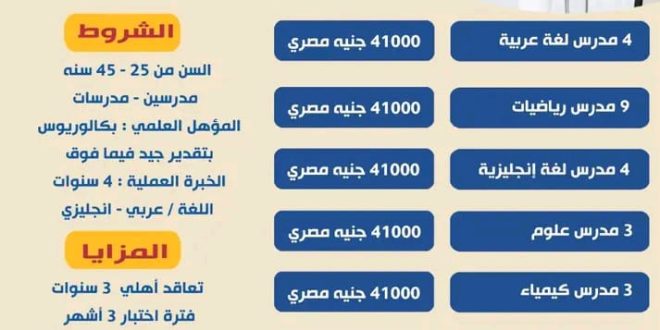 أعلن وزير العمل السيد / محمد جبران اليوم الأحد، عن توفير 38 فرصة عمل لكوادر مصرية في مجال التدريس للجنسين ، وسائقين ، ومسجلي شؤون ،وكول سنتر ، للعمل في إحدى المعاهد التعليمية بالدول الخليجية،براتب شهري يعادل41 ألف جنيه مصري ..وقال الوزير أن هذه الفرص تأتي في إطار جهود الوزارة لتوفير فرص عمل للشباب المصري بالخارج ، بالتنسيق بين الإدارة المركزية للعلاقات الدولية ، ومكاتب التمثيل العمالي بالخارج ،والإدراة العامة للتشغيل …ودعا الوزير الشباب الذين تتوفر فيهم الشروط تقديم السيرة الذاتية على البريد الالكتروني التالي : employment@labour.gov.eg ،وأوضح أن شروط و مميزات هذه الفرص الجديدة أن السن من 25 الى 40 سنة ، والمؤهل العلمي بكالوريوس بتقدير جيد فيما فوق،والخبرة العلمية 4 سنوات ،واجادة اللغتين العربية والإنجليزية،و مدة التعاقد 3 سنوات ،وفترة اختبار 3 أشهر ،وضمان صحي،وتوفير سكن ومواصلات وشهر كل عام إجازة سنوية …من جانبها قالت هبة أحمد مدير عام الإدارة العامة للتشغيل أن عدد الفرص المطلوبة هي 9 مدرس رياضيات ،و3 مدرس فيزياء ،و3 مدرس كيمياء ،و3 مدرس علوم ،و 4 مدرس لغة إنجليزية ،4 مدرس لغة عربية و 4 سائق ،و4 مسجل شؤون ،و4 كول سنتر …وقالت إن إدارة التشغيل سوف تستقبل السيرة الذاتية من السادة المتقدمين لمدة 5 أيام ، من اليوم الأحد الموافق 9-3-2025 وحتى 13-3-2025 ..وأنه سيتم التواصل مع المرشحين لإجراء الاختبارات لهم تمهيدا لسفرهم..