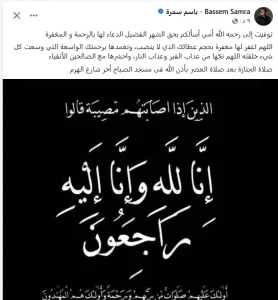 وكتب باسم سمرة: “توفيت إلى رحمة الله أمي أسألكم بحق الشهر الفضيل الدعاء لها بالرحمة والمغفرة، اللهم اغفر لها مغفرة بحجم عطائك الذي لا ينضب، وتغمدها برحمتك الواسعة التي وسعت كل شيء، اللهم نجّها من عذاب القبر وعذاب النار، واحشرها مع الصالحين الأتقياء”