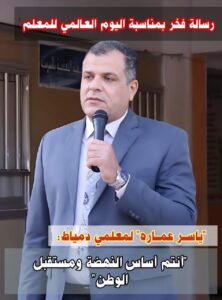 بمناسبة اليوم العالمي للمعلم، وجّه الأستاذ ياســر عمـاره، وكيل وزارة التربية والتعليم بدمياط، رسالة تقدير وفخر إلى جميع المعلمين والمعلمات في المحافظة، مؤكداً أنهم يمثلون “أساس النهضة ومستقبل الوطن”.