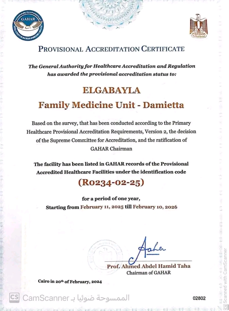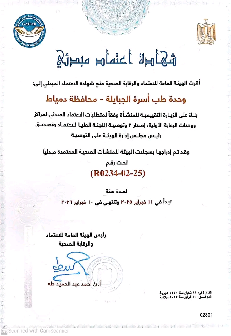 فى اطار استعدادات مديرية الصحة لدخول منظومة التامين الصحي الشامل بالمحافظة و بعد اعتماد الهيئة العامة للاعتماد و الرقابة على اعتماد الوحدة الصحية بالجبايلة و تحقق معايير GAHAR