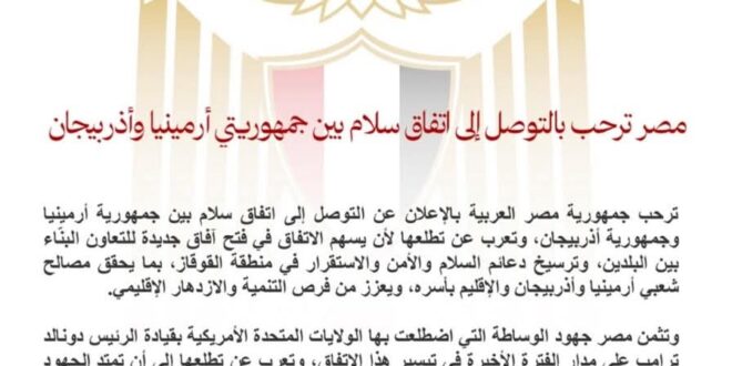 ترحب جمهورية مصر العربية بالإعلان عن التوصل إلى اتفاق سلام بين جمهورية أرمينيا وجمهورية أذربيجان، وتعرب عن تطلعها لأن يسهم الاتفاق في فتح آفاق جديدة للتعاون البنّاء بين البلدين، وترسيخ دعائم السلام والأمن والاستقرار في منطقة القوقاز، بما يحقق مصالح شعبي أرمينيا وأذربيجان والإقليم بأسره، ويعزز من فرص التنمية والازدهار الإقليمي.