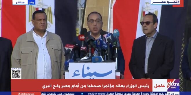 تحدث الدكتور مصطفى متبولى رئيس مجل الوزراء من امام معبر رفح هلال المؤتمر الصحفى أنه لابد أن تتوقف الخسائر الانسانية ولا تحل إلا بحل الدولتين لابد أن يتبنى العالم كله هذا الحل ونحن في مصر من أول يوم نتبي هذا الحل العادل الذي أقره العالم قبل ذلك، مشيرا الى اننا من هذا المقر ندعو العالم لهذا الحل.