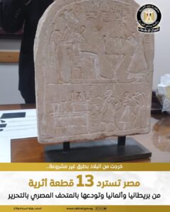 استعادة القطع الأثرية من المملكة المتحدة بعد أن تمكنت السلطات البريطانية، ممثلة في شرطة العاصمة لندن، من ضبطها ومصادرتها، وذلك عقب ثبوت خروجها من مصر عبر شبكة دولية متخصصة في تهريب الآثار