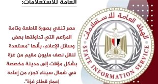 أكمل القراءة »” فى تصريح صادر عن الهيئة العامة للاستعلامات المصرية .. نفت مصر بصورة قاطعة وتامة المزاعم التي تداولتها بعض وسائل الإعلام، بأنها “مستعدة لنقل نصف مليون مقيم من غزة بشكل مؤقت إلى مدينة مخصصة في شمال سيناء كجزء من إعادة إعمار قطاع غزة “…